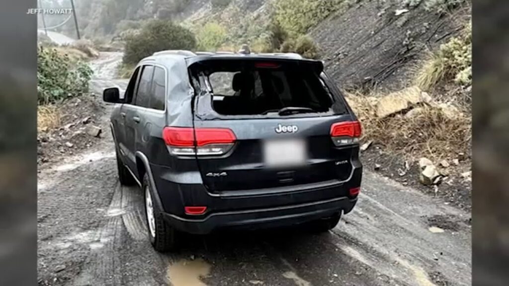 Boulder slams into driver’s Jeep during rain in SoCal mountains
