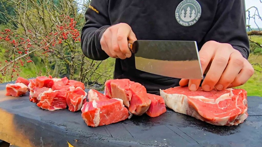 Enter the star: the ribeye. A generous cut of beef ribeye, with rich marbling, thick walls of flavor ready to be tapped. The choice of ribeye is perfect for fire-based cooking: the fat renders, the edges crisp, the interior stays juicy. The video shows the preparation simply—maybe trimming a bit, maybe seasoning with just salt and pepper, perhaps a hint of wild herbs. The point is not to mask the meat’s flavour but to amplify it. In the wild setting, with open flame, the ribeye becomes both sustenance and celebration.